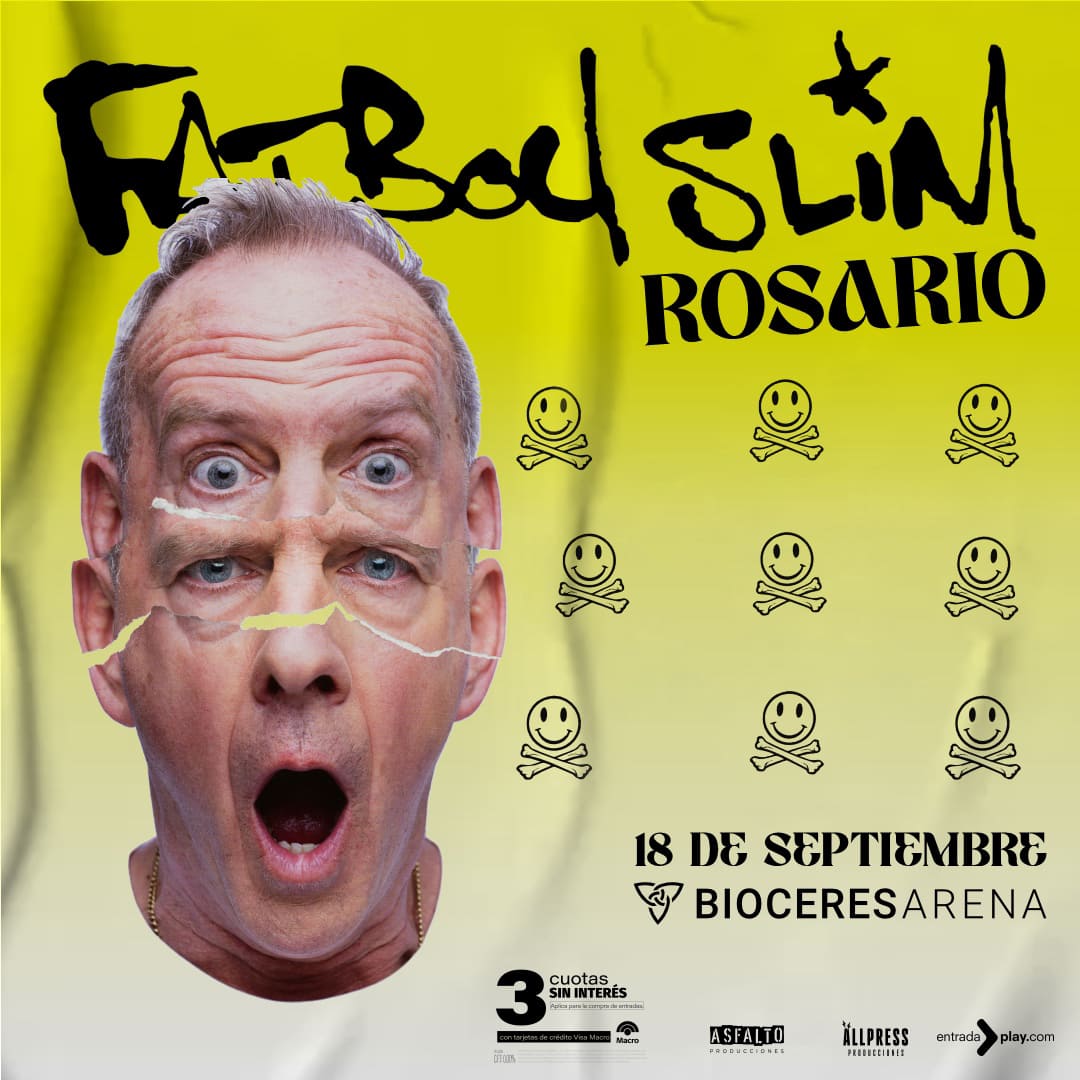 Fatboy Slim llega a Rosario con un show imperdible el jueves 18 de septiembre en Bioceres Arena. Desde las 19 h se abrirán las puertas del estadio (Av. Córdoba 3475) para recibir al reconocido DJ británico que marcó la historia de la música electrónica con himnos como Praise You y Right Here, Right Now.