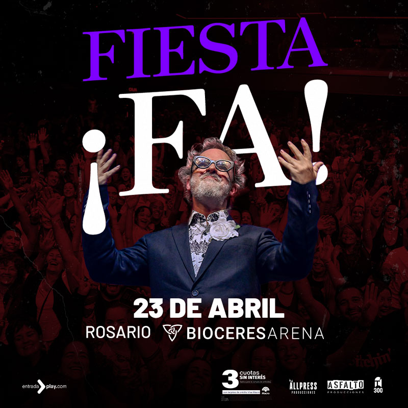 Conducida por Mex Urtizberea, la Fiesta ¡FA! llega el 23 de abril al Bioceres Arena con su formato impredecible que mezcla música en vivo, humor y cruces artísticos únicos, reuniendo a grandes figuras sin grilla anunciada y transformando cada edición en una experiencia irrepetible. Un fenómeno que nació en streaming y hoy convoca multitudes en cada ciudad.