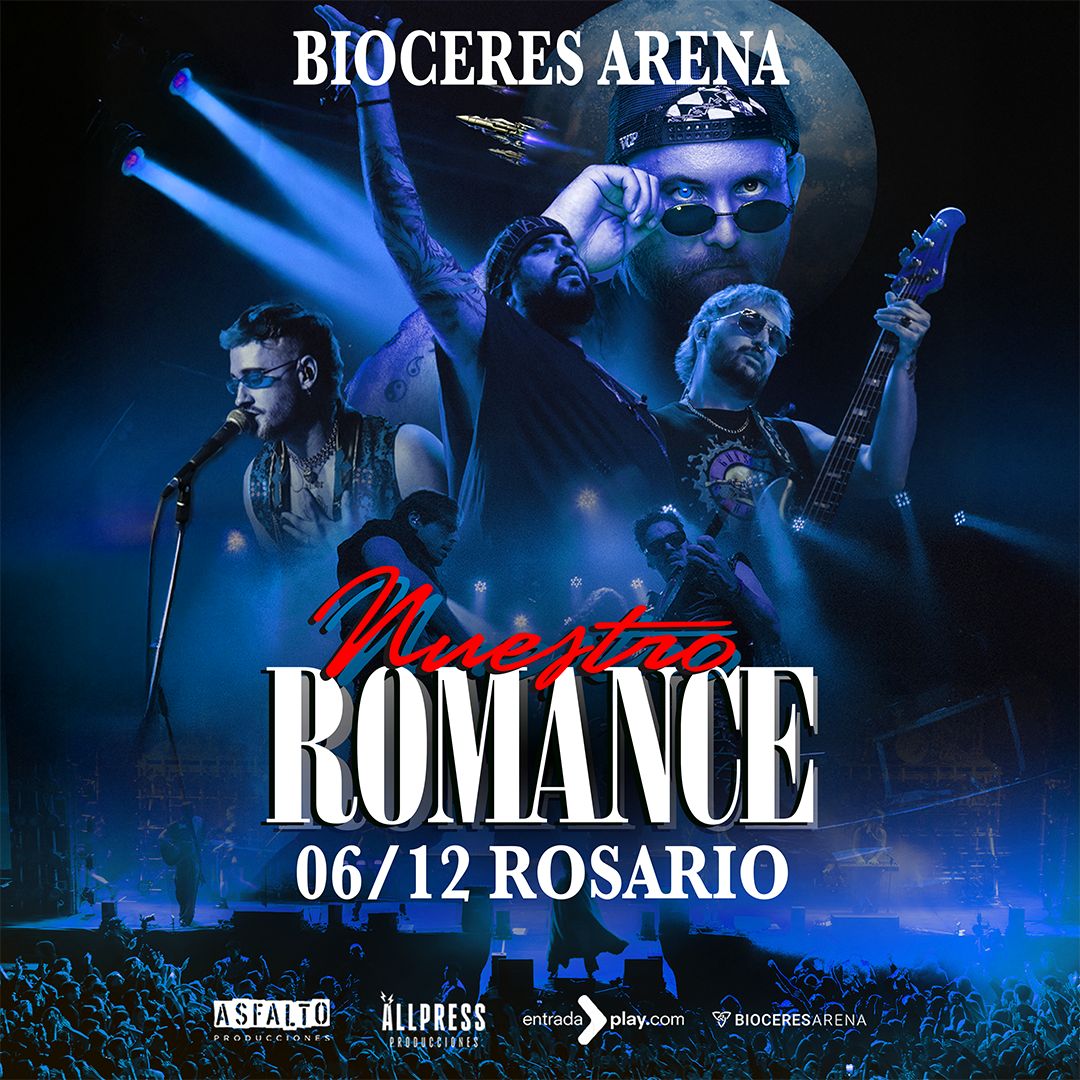 La banda Nuestro Romance se presenta en Bioceres Arena —Av. Córdoba 3475, Rosario— el sábado 6 de diciembre, con apertura de puertas a las 23:59 hs.